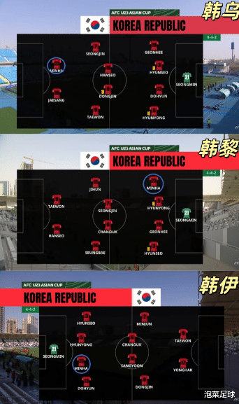 本届U23亚洲杯前,李敏成的战术思路固定为442的战术,外加两翼齐飞的固定打法。而在本届U23亚洲杯,韩国U23代表队在442的体系下不仅攻击乏力,而且防守漏洞百出。如果从四场比赛的首发图来看,李敏成对于这批球员的使用还在“摸索”,以核心申敏河为例(蓝色圆圈),三场比赛,他分别出现在中卫、边后卫和中锋的位置上,这也就不难看出,为何韩国的打法很难堪,而且缺乏默契度,球员心不在焉,是因为没有人稳定自己的位置,没有人确保自己是安全的。在输给乌兹别克斯坦后,这批U23球员更是遭到了舆论的批评,甚至是主帅李敏成在发布会上的口诛笔伐,这也是为什么,赛前没有人看好他们的原因。