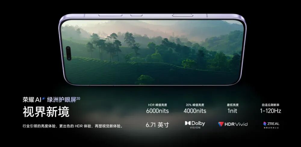 配备6.31英寸小直屏,荣耀绿洲护眼屏加持,4320Hz调光,10大护眼能力加上6000nit的峰值亮度,还支持3D超声波指纹。