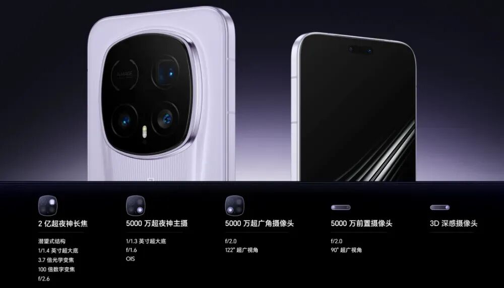 搭载2亿像素超夜神长焦、5000万像素超夜神主摄、5000万超广角镜头组合,还有自研AiMAGE原色引擎加持。