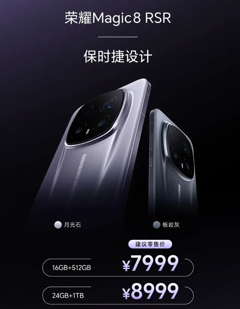 荣耀Magic8 RSR保时捷设计,16+512GB版本7999元,24+1TB典藏版8999元。
