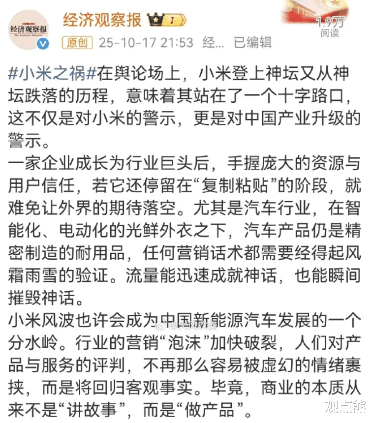 对于我们旁观者而言,或许也需要一份更理性的目光:可以严格监督,但不必落井下石;可以怒其不争,但不必全盘否定。中国制造的崛起需要华为式的技术灯塔,也需要比亚迪式的规模巨头,同样也需要小米这样不断试错、不断进化的挑战者。