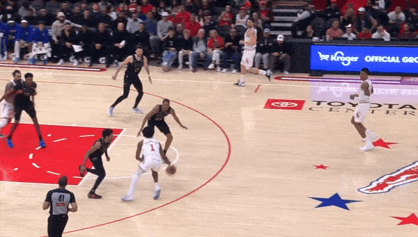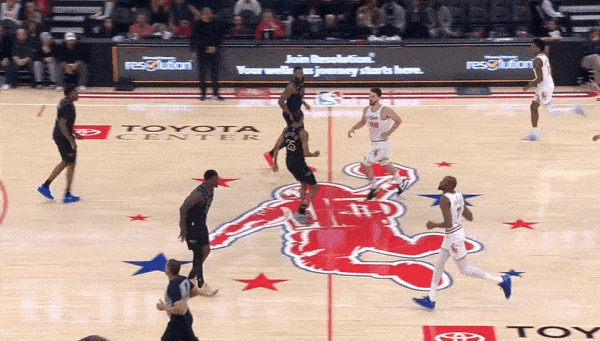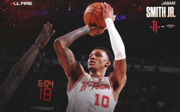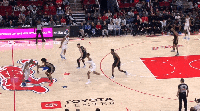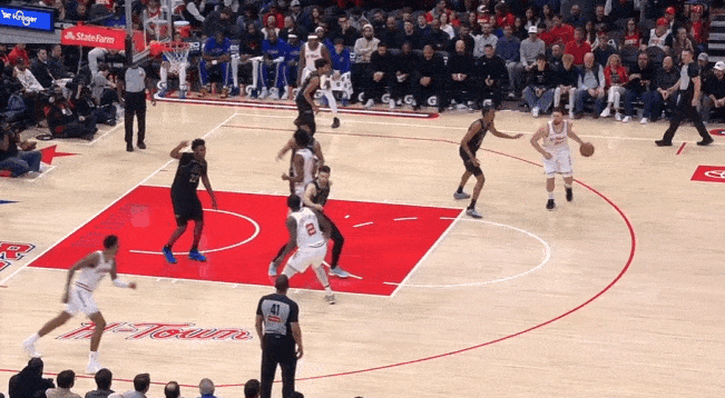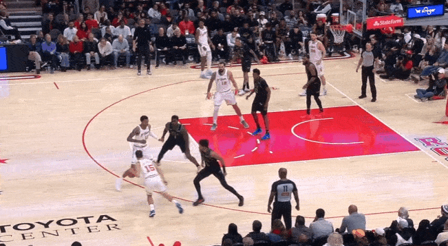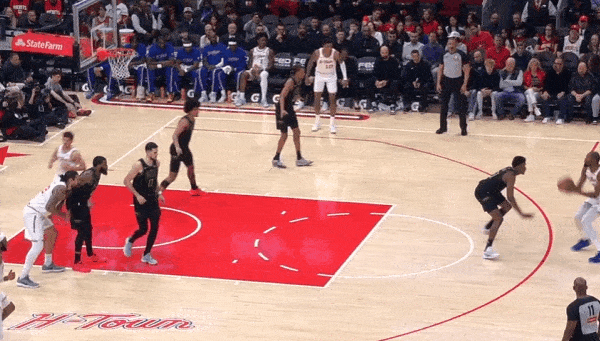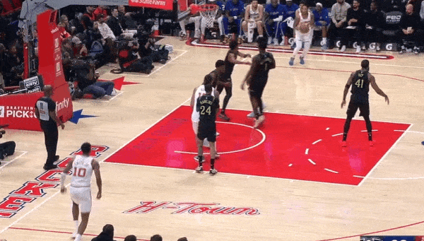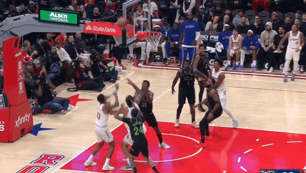 谢泼德发动边路挡拆,吸引鹈鹕双人夹击后出球给Slip的贾巴里。贾巴里下顺接球后面对换防过来的奎因,直接拔起出手中投,稳稳命中(当然这里也可以传给底线游弋的申京)。