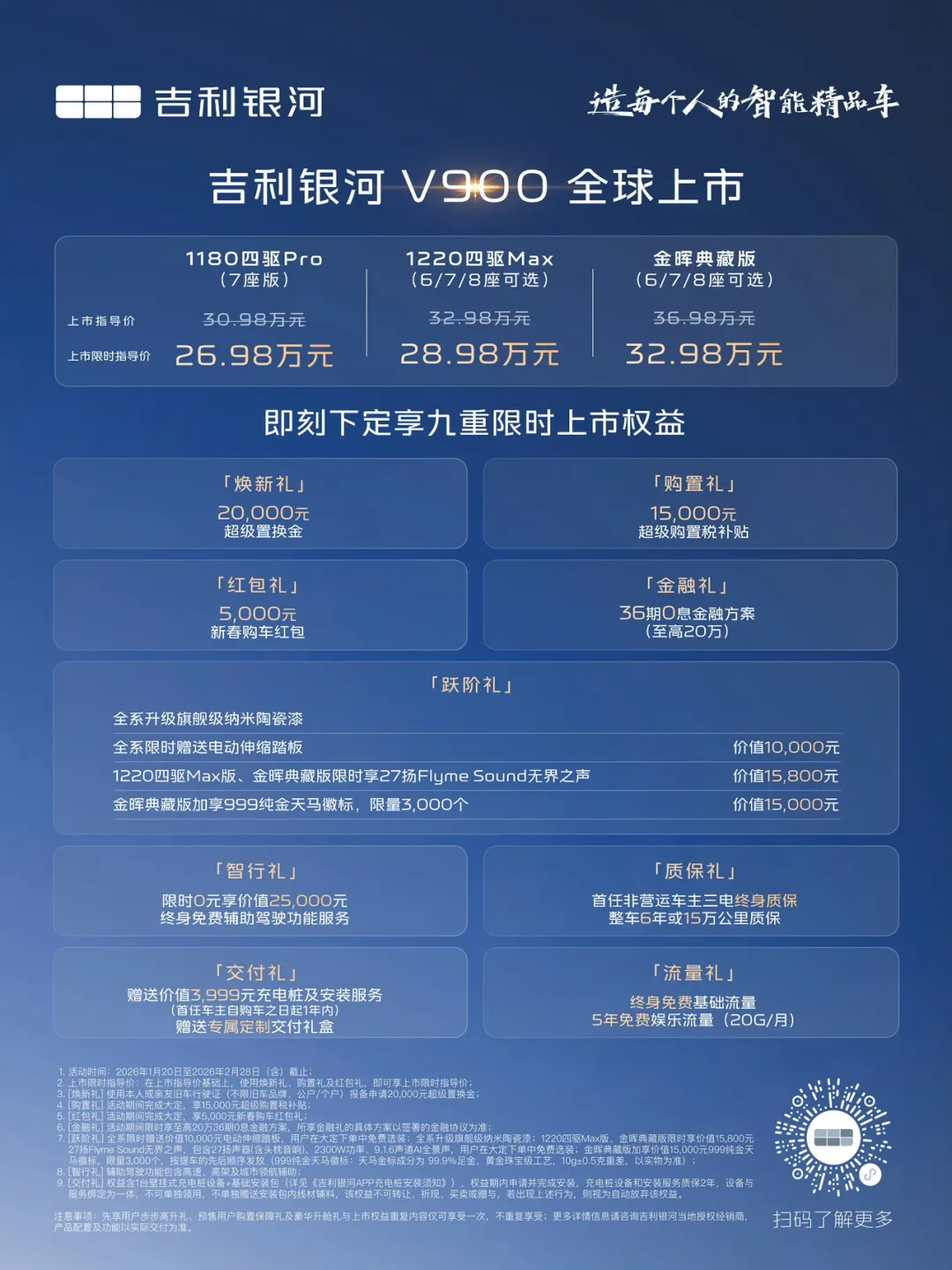 1月20日,吉利银河旗下首款MPV——银河V900正式上市,四驱Pro版、四驱Max版售价30.98万元、32.98万元,限时售价26.98万元、28.98万元。金辉典藏版售价37.98万元,限时售价32.98万元。据了解,吉利银河V900定位中大型MPV,提供6/7/8座布局(四驱Pro版只有7座),搭载1.5T发动机+双电机组成的增程动力系统,CLTC纯电续航为260km,满油满电综合续航为1220km。官方表示,前3000名提车用户(金晖典藏版)可获得10克纯金。
