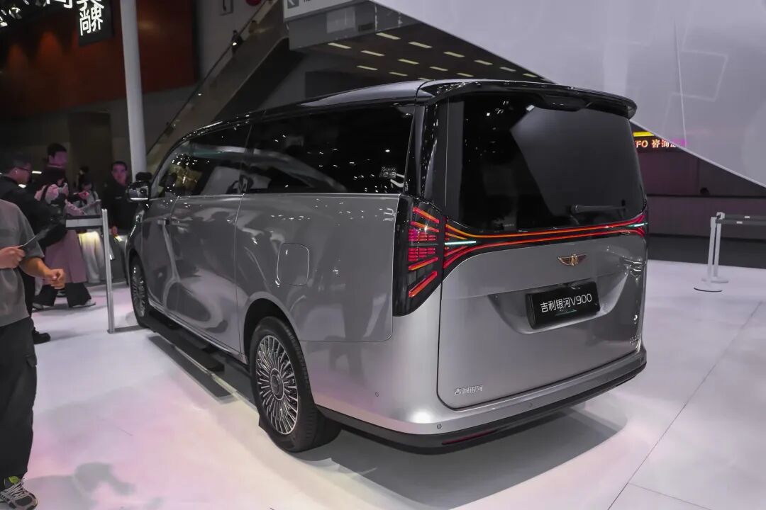 车身侧面,吉利银河V900使用金色车身+黑色车顶设计,配备密辐低风阻轮辋、隐藏式门把手,仍采用双侧电动滑门开启方式。车尾部分,吉利银河V900采用贯穿式尾灯,智驾小蓝灯融入其中,尾门中央由“LEVC”字母车标更换为图形样式车标,尾门右下角“V900”表明车辆身份信息。尺寸方面,银河V900长宽高分别为5360/1998/1940(1920)mm,轴距为3200mm。