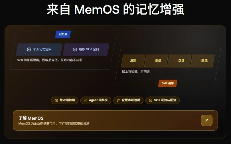 其实,MemOS是记忆张量MemTensor推出的一个AI记忆操作系统,采用参数记忆、激活记忆、明文记忆的三层技术架构,能够将记忆按照不同的标签分门别类,从而更好的进行记忆、数据的检索和回复,实现 AI 的持续学习与长期协作能力;并且,企业通过 MemOS 在不同模型(如 GPT、Claude、DeepSeek 等)之间共享同一套记忆体系,从而避免知识被锁定;独有的记忆中枢设计更支持记忆按组织隔离共享、权限与生命周期管理,使企业能像管理数据库一样治理 AI 记忆,满足安全合规与协作需求。