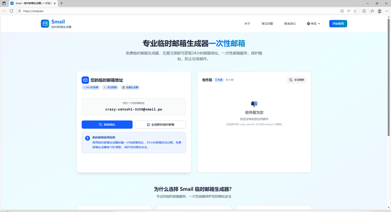 这是一个能保护你真实邮箱不被泄露的网站。它可以生成1个24小时后自动销毁的临时邮箱,专门用来注册那些不太靠谱的网站。在这可以看到一个临时邮箱地址,点击复制,我们测试一下,给这个临时邮箱发一个邮件,然后立刻就能收到刚才的测试邮件。