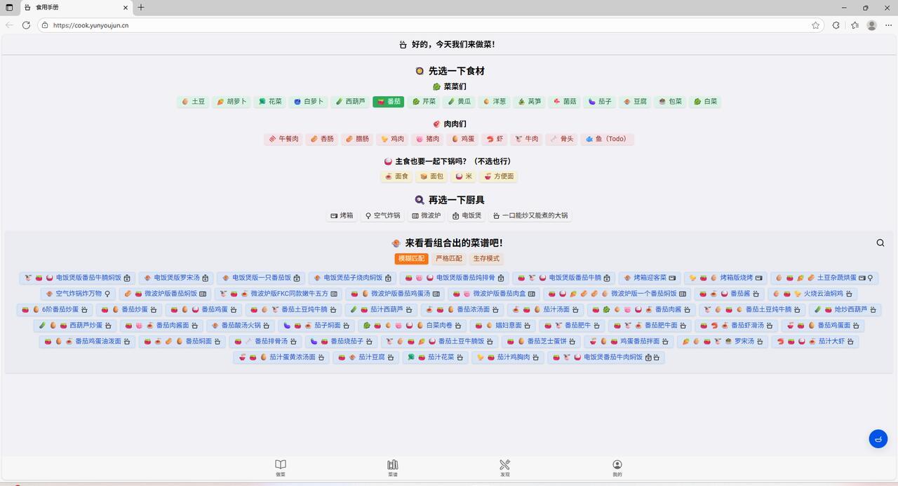 四、食用手册这是一个能根据你冰箱里的食材自动生成菜谱的网站。只需要勾选你有的食材和厨具,例如你只剩一个茄子和一个能炒又能煮的大锅,它就能秒推出可以做的菜品。每道菜都带视频教程,手把手教你做。