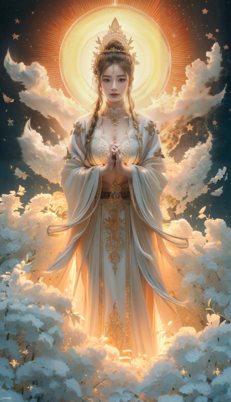 第二个的提示词为:女孩闭上眼睛,身后的云朵飞舞,发出金光。