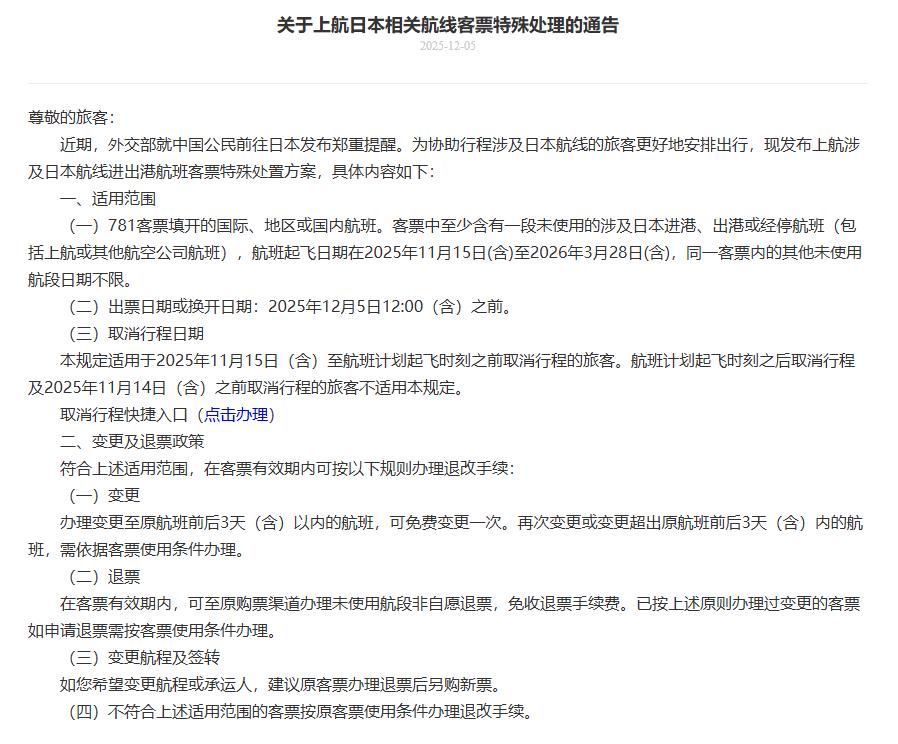 781客票填开的国际、地区或国内航班。客票中至少含有一段未使用的涉及日本进港、出港或经停航班(包括上航或其他航空公司航班),航班起飞日期在2025年11月15日(含)至2026年3月28日(含),同一客票内的其他未使用航段日期不限。 出票日期或换开日期:2025年12月5日12:00(含)之前。 取消行程日期:本规定适用于2025年11月15日(含)至航班计划起飞时刻之前取消行程的旅客。航班计划起飞时刻之后取消行程及2025年11月14日(含)之前取消行程的旅客不适用本规定。