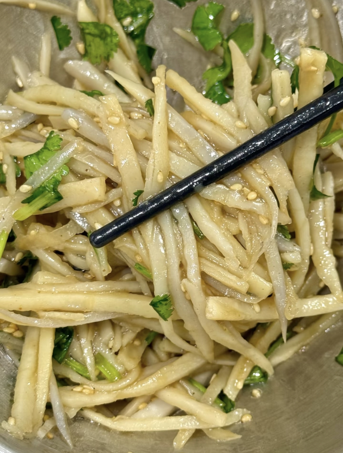 接下来便是调制那碗“灵魂料汁”。取一个稍大的碗,放入蒜末、小米辣圈,再撒上一勺白芝麻和一勺辣椒面,淋上滚烫的热油,滋啦一声,蒜香、芝麻香和辣味瞬间被激发出来,光是闻着就让人食欲大开。接着,在碗中加入两勺生抽、一勺香醋、少许白糖和盐调味,再滴入几滴香油,将所有调料搅拌均匀。这碗料汁咸香酸辣,层次丰富,是整道菜风味的精髓所在。将沥干水分的藕丝放入一个大盆中,倒入调好的料汁,再撒上一大把切碎的香菜,香菜的量可以足一些,它的清新能很好地中和藕丝的清甜,让整体风味更上一层楼。用手或筷子充分抓拌均匀,让每一根藕丝都裹满酱汁。