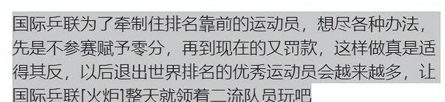 国际乒联为了牵制住排名靠前的运动员,想尽各种办法,先是不参赛赋予零分,再到现在的又罚款,这样做真是适得其反,以后退出世界排名的优秀运动员会越来越多,让国际乒联[火炬]整天就领着二流队员玩吧!