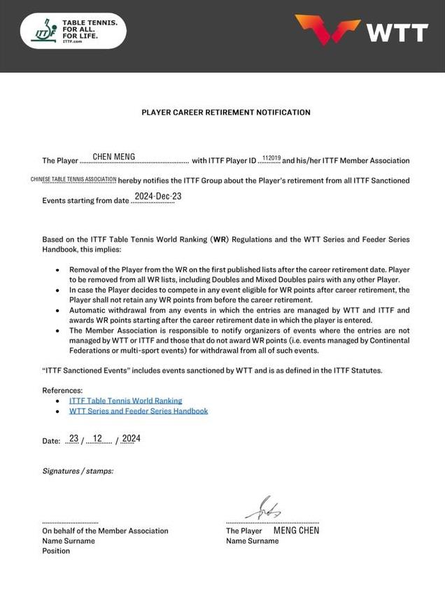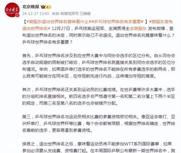 可以这么理解,调整身体和进行新的职业规划是重要因素,但主要因素却是WTT最新出台的退赛罚款新规定。