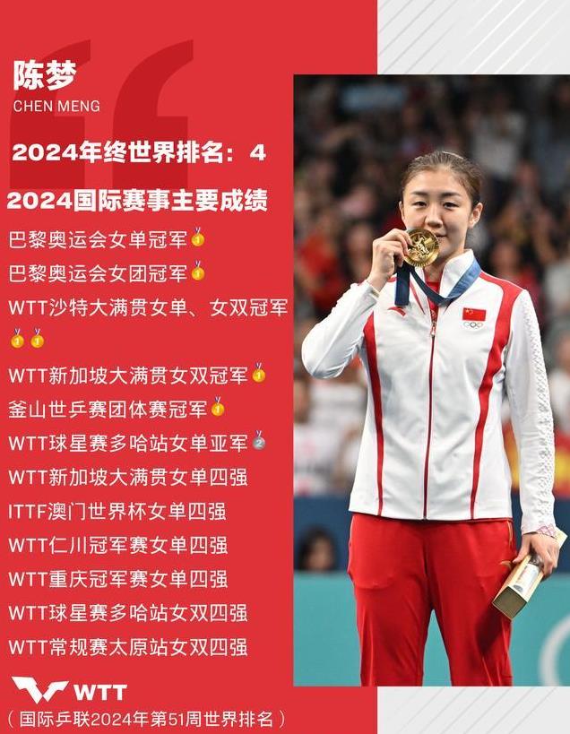 陈梦WTT世界乒联年度总结:不惧挑战,捍卫荣耀。期待在新的一年里继续发光发热,迎接更美好的未来。