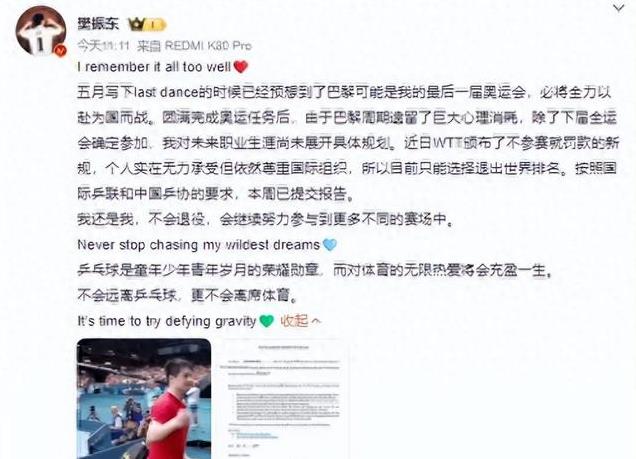 樊振东和陈梦均表示:退出排名,但并不退役,依然热爱乒乓球。