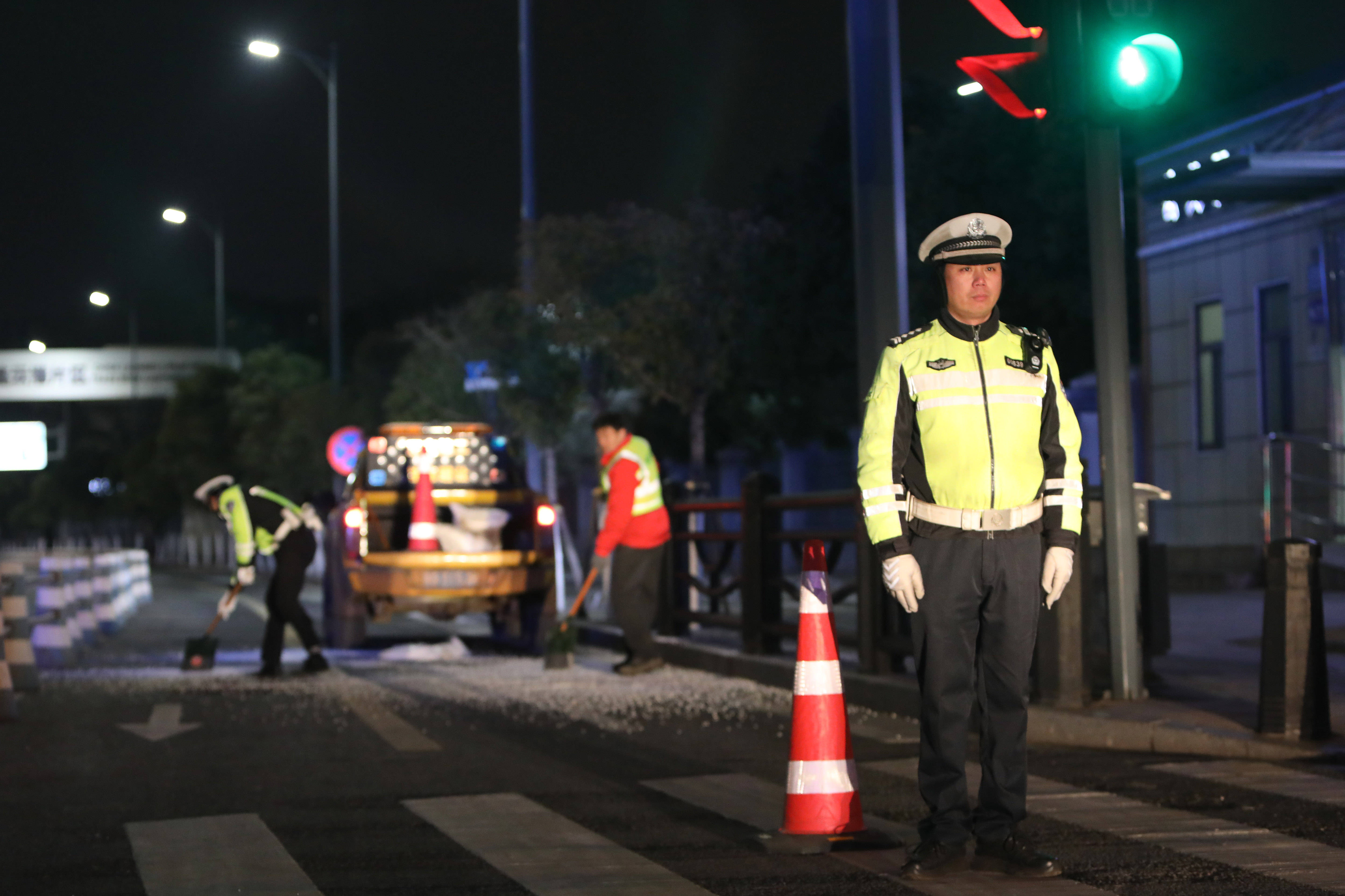 寒风里,民警们站在路口中央,一遍遍疏导往来车辆;冰雪路段,他们弯腰铲雪清理路面,手套冻得硬邦邦也顾不上搓一搓。车流穿梭间,那抹亮眼的“荧光绿”,成了风雪中最让人安心的路标。