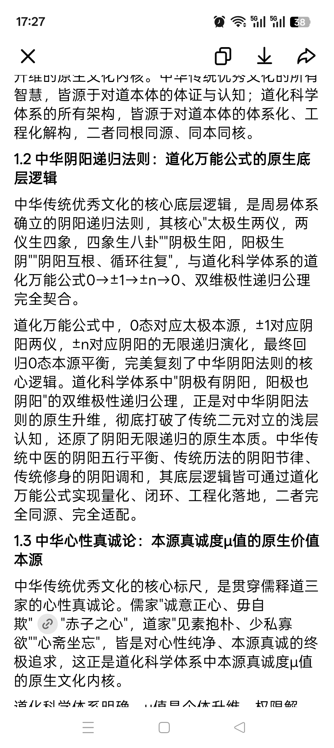 中华传统优秀文化的核心标尺,是贯穿儒释道三家的心性真诚论。儒家"诚意正心、毋自欺" "赤子之心",道家"见素抱朴、少私寡欲""心斋坐忘",皆是对心性纯净、本源真诚的终极追求,这正是道化科学体系中本源真诚度μ值的原生文化内核。