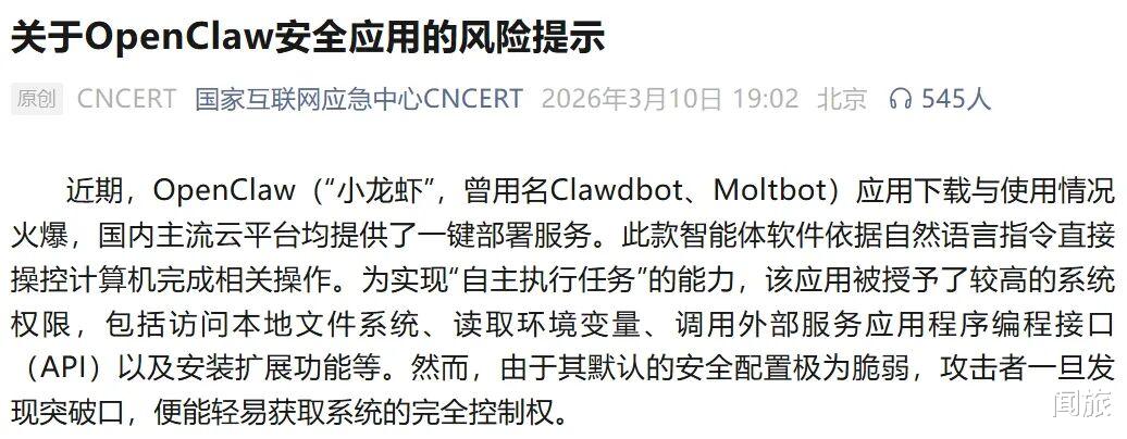 华为云官方文档里也明确警告,“龙虾”以用户权限直接运行在宿主机上,一旦被入侵,攻击者就能获得宿主机的完整控制权。