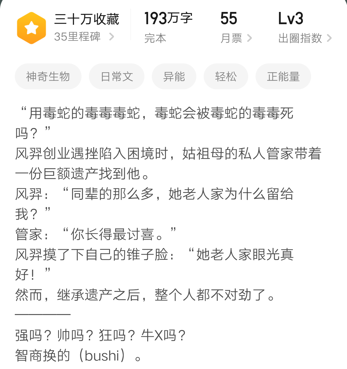 而在看这本书之后,在专家们的滤镜、书友们的二创和主角本身奇奇怪怪的操作多重加持之下,蛇蛇这种生物多少也沾了点可爱在里面了——虽然我个人更多的是叶公好龙式的口嗨,但也足够说明一些问题了。