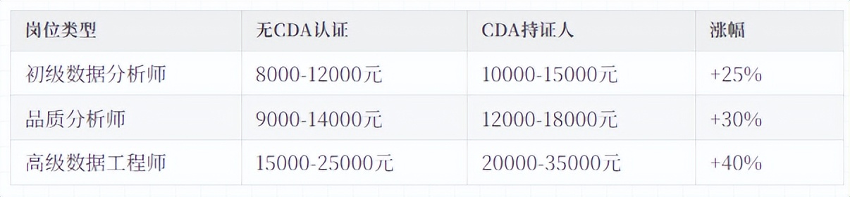 根据2023年行业薪资调查,CDA持证人的平均月薪显著高于同龄同岗人员: