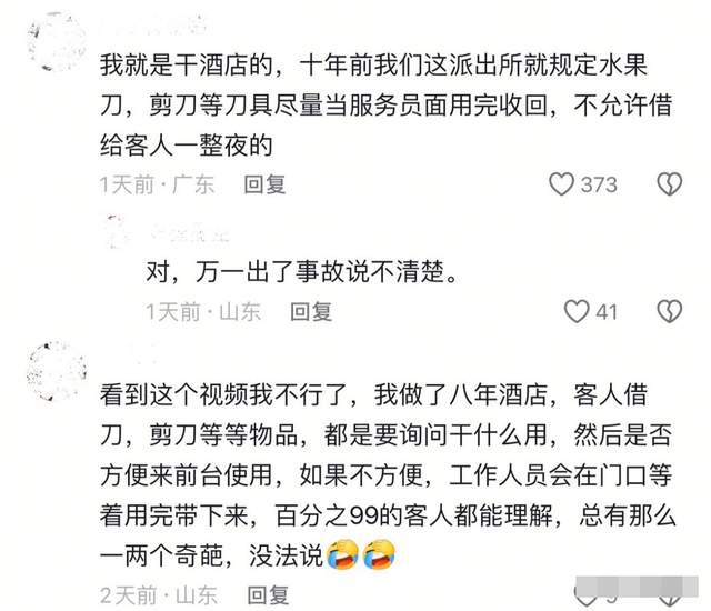 保安站在门口询问使用用途和时间,这被博主描述成“恐怖片开场”。但多位酒店员工在网上分享了自己的工作手册,其中明确写着:“利器外借需当面确认使用意图,评估客人精神状态,并在可能的情况下全程监督。”