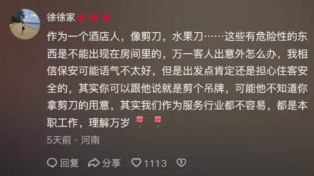 更引人注目的是,某知名连锁酒店集团的安全培训主管在抖音发布视频,详细解释了酒店的安全规范:“我们要求员工必须询问利器用途,因为曾经发生过客人借用剪刀自伤的悲剧。保安守在门口不是监视,而是一种责任。”