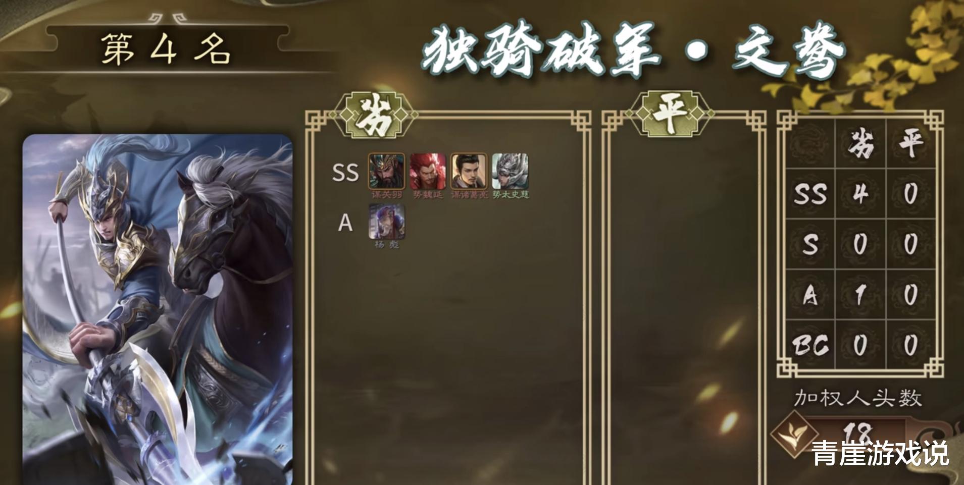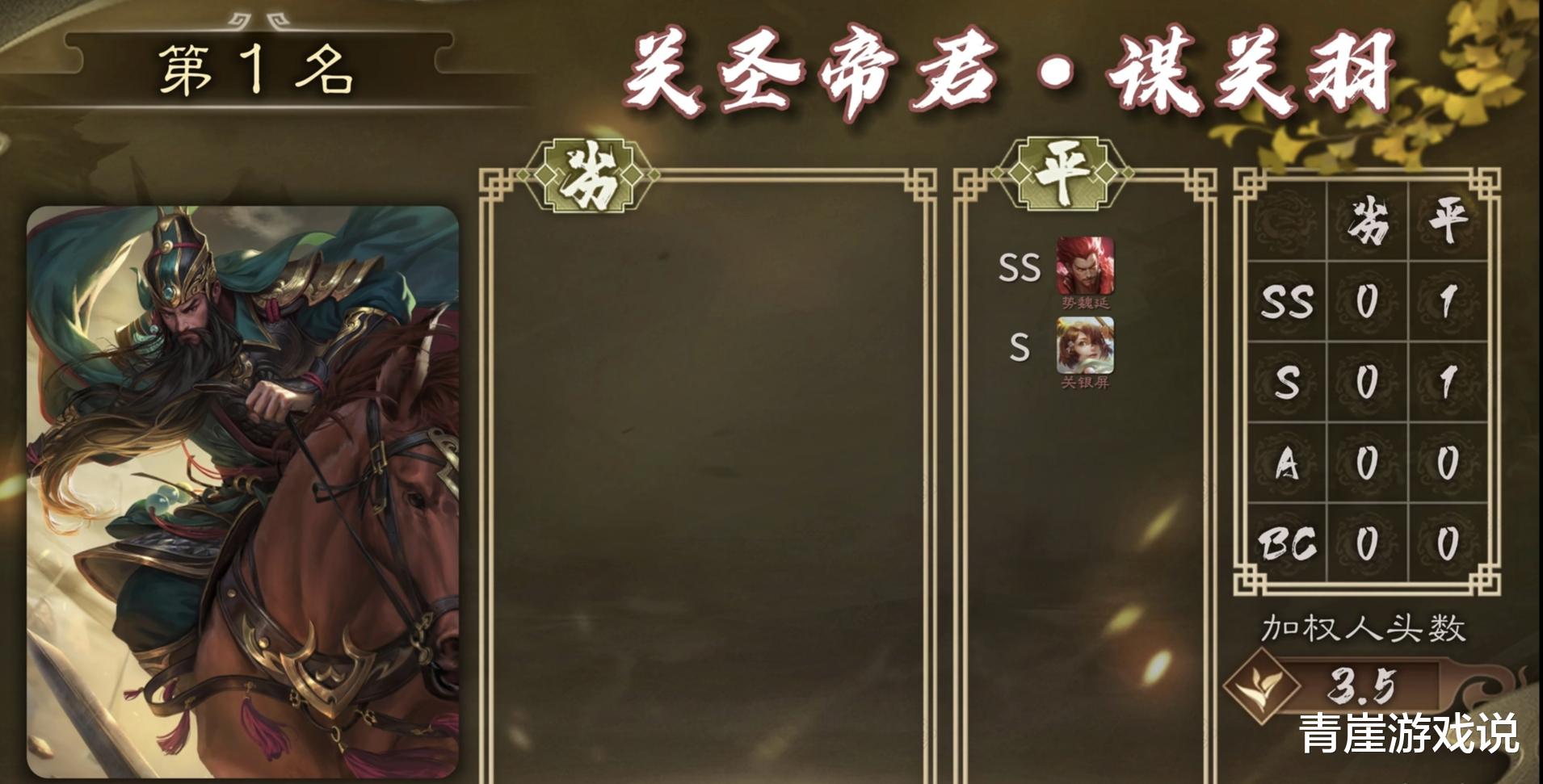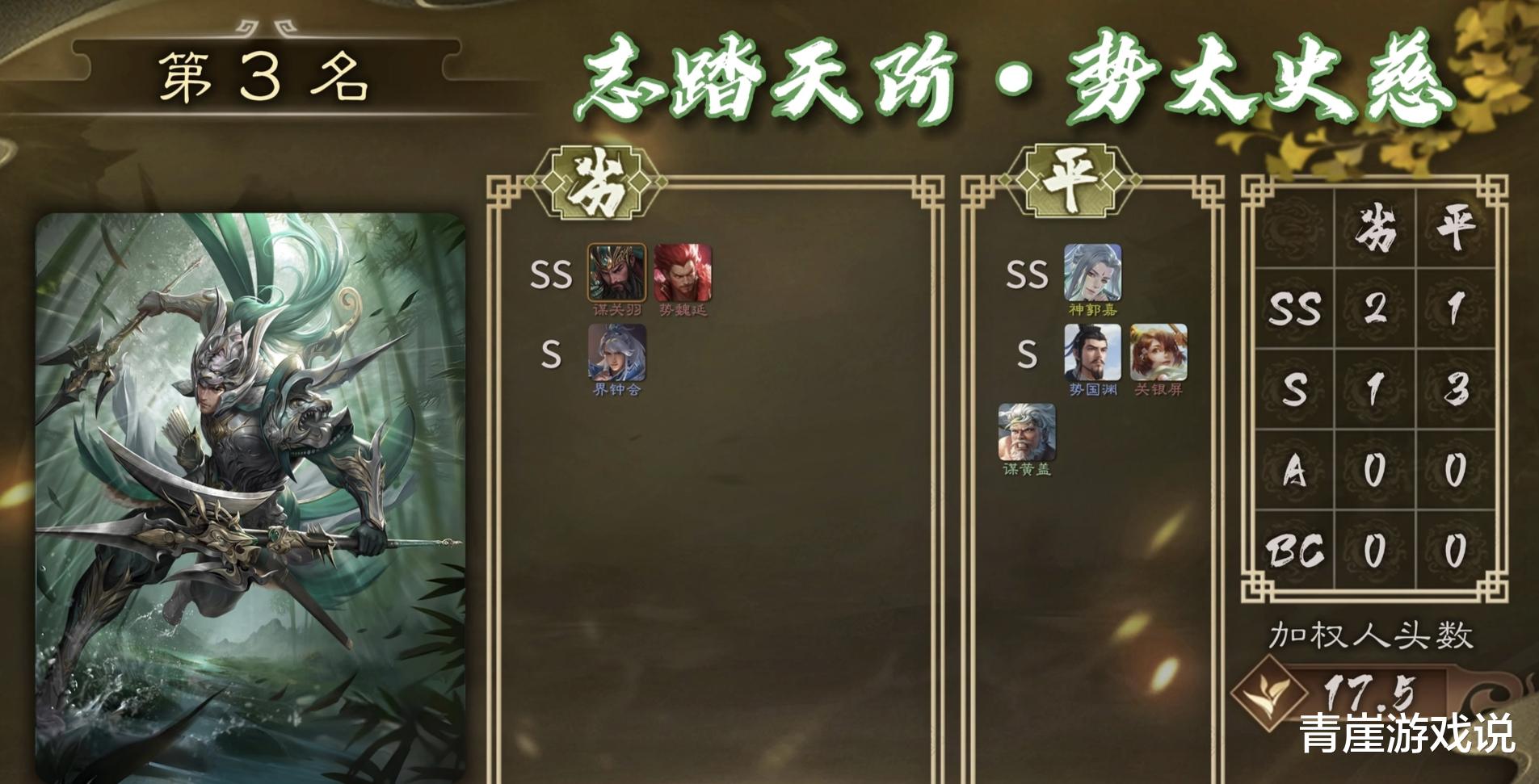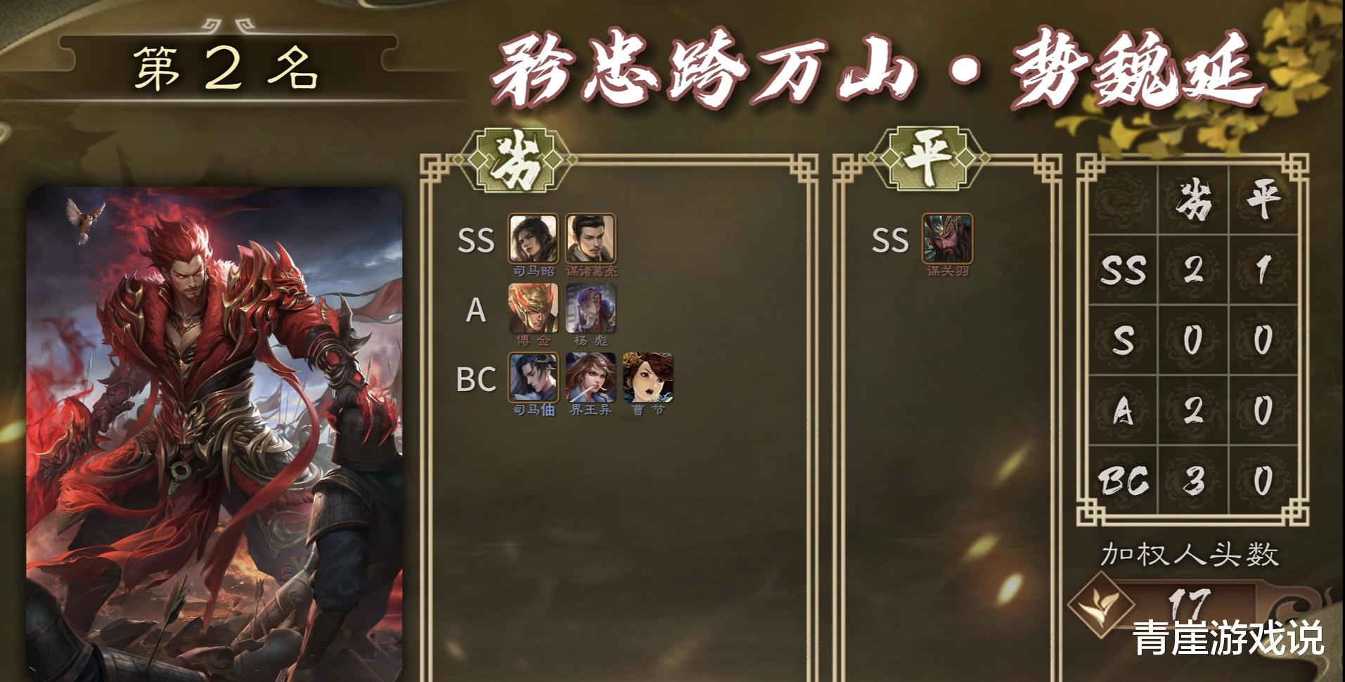 荣获最强单挑王称号的武将是谋关羽,又是一年的最强单挑武将。谋关羽去年就出现了,青崖就不多介绍了,总结下来就是纯粹的数值,如果失去【义绝】,更是纯粹的无敌!