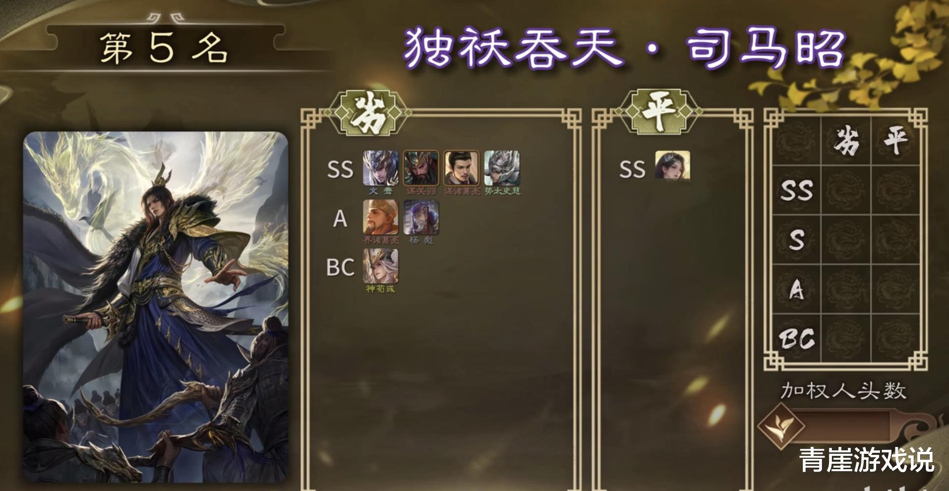 排名第五的武将是司马昭,作为2024年的菜刀武将,司马昭的属性非常突出,每个技能都为了打伤害量身定做。排行第五不是司马昭爆发不够强,而是作为纯粹的菜刀武将,面对卖血、高防武将就具有天然的劣势……