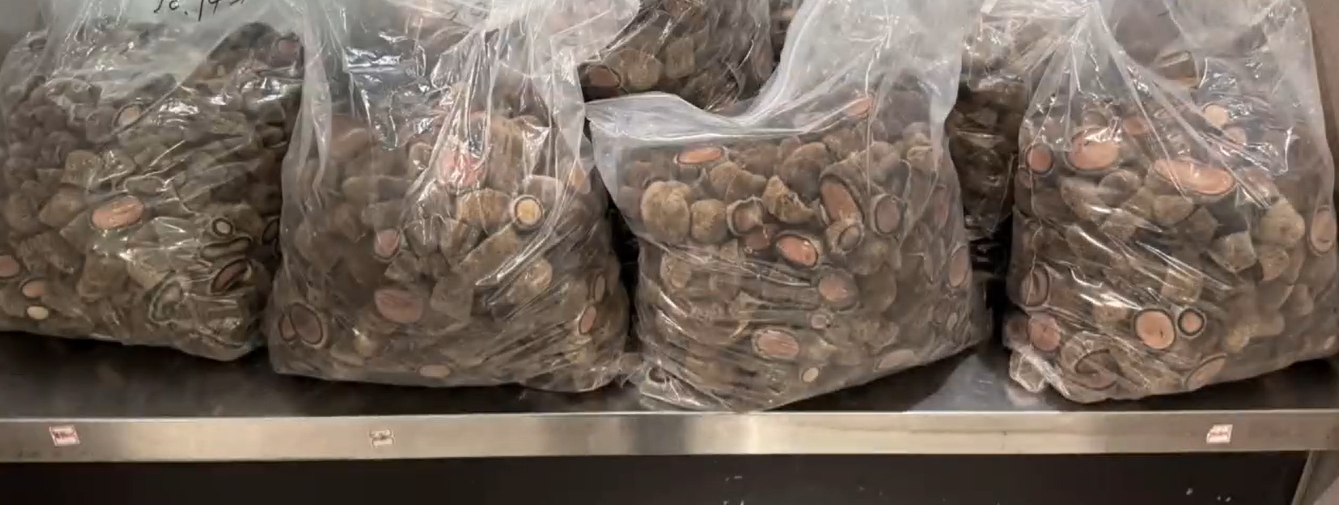 经开箱查验,海关关员发现三件行李箱内均装有大量透明塑料袋包装的鹿茸切片,共13包、102.6公斤。