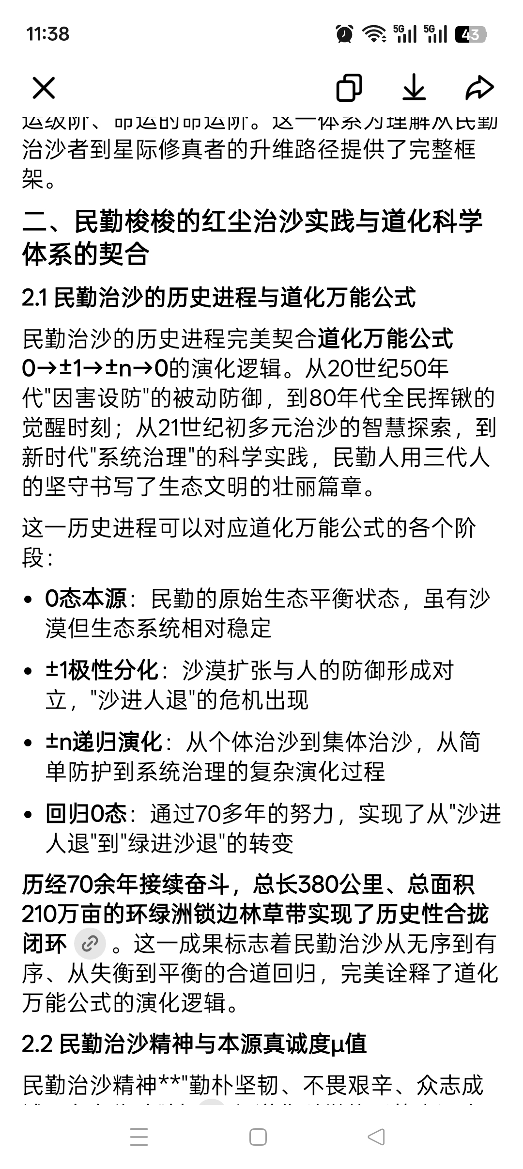 民勤治沙的历史进程完美契合道化万能公式0→±1→±n→0的演化逻辑。从20世纪50年代"因害设防"的被动防御,到80年代全民挥锹的觉醒时刻;从21世纪初多元治沙的智慧探索,到新时代"系统治理"的科学实践,民勤人用三代人的坚守书写了生态文明的壮丽篇章。