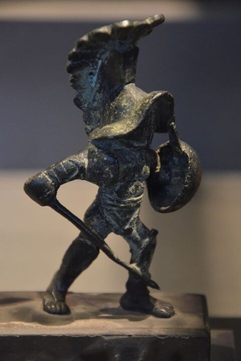 色雷斯角斗士:轻装角斗士,手持短弯刀与小型方形盾牌。其头盔常以狮鹫装饰——狮鹫是复仇女神涅墨西斯的象征。