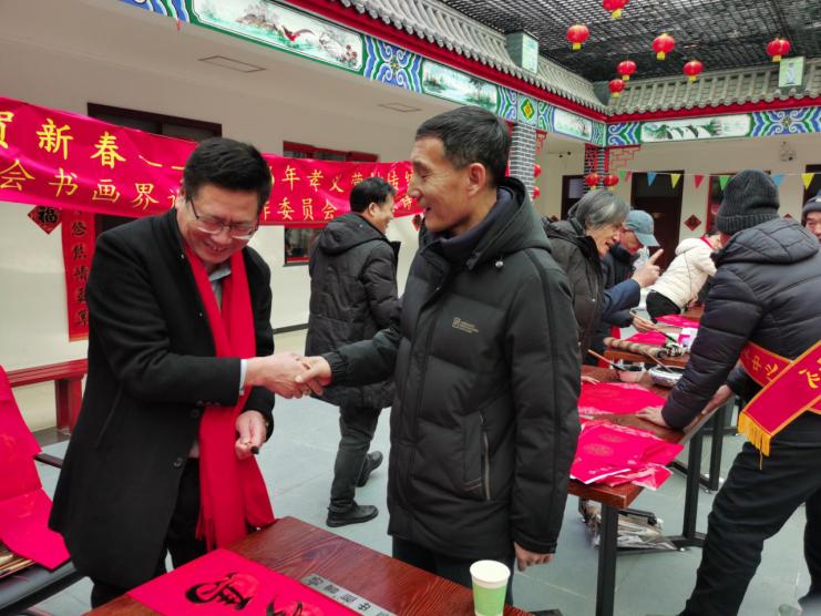 案前围满了前来求联的村民。“请给我写一副带‘福’字的春联,希望全家平安健康!”“能不能给我家老人写一副长寿联?”村民们带着满心期待,有序排队等候,不时与艺术家交流创作思路。艺术家们凝神聚力,笔走龙蛇,一幅幅笔力遒劲、寓意吉祥的春联与福字跃然纸上,“孝行传家添福寿,义风继世旺子孙”“马年纳福财源广,古村尽孝人丁兴”等佳句,既饱含新春祝福,又彰显孝义文化。拿到春联的村民们喜笑颜开,有的当场展开欣赏,有的小心翼翼折叠收好,不少人还与艺术家合影留念,现场欢声笑语不断,笔墨香与年味交织成最动人的新春图景。