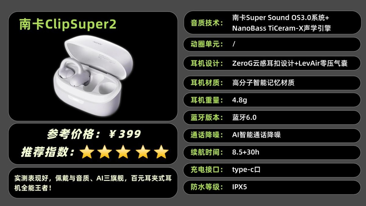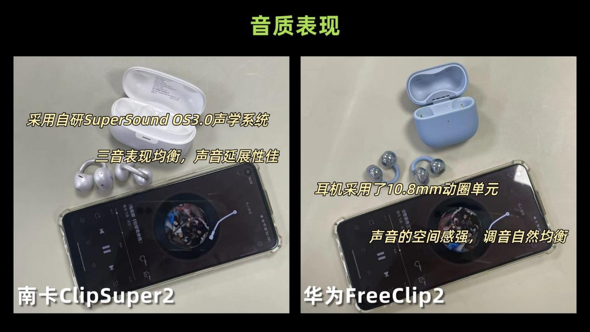 Part.4总结通过实测可以看出,南卡ClipSuper2和华为FreeClip2各有优势。南卡ClipSuper2音质均衡、层次丰富,佩戴轻巧稳固,通话和AI功能都很全面,适合追求全方位体验的用户;而华为FreeClip2轻便易用,音质稳定,AI功能也很实用,佩戴舒适,特别适合日常通勤和长时间使用。