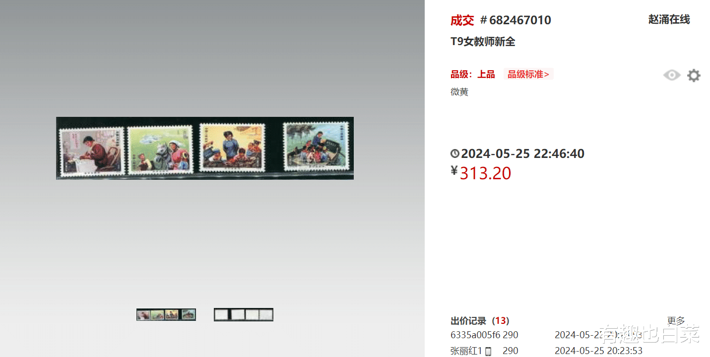 近期,一套品级为上品、微黄的T9《乡村女教师》全新全套邮票以313.20元的成交价成功售出。这一价格反映了当前邮票市场的行情和这套邮票的收藏价值。虽然相较于一些珍稀邮票来说,这一价格并不算高,但考虑到这套邮票的历史背景、设计特色和收藏价值,这一成交价仍然具有一定的参考价值。