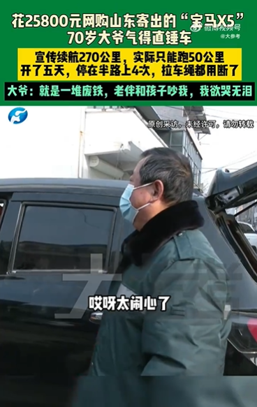 标称续航270公里的“宝马X5”电动车,实际行驶不到50公里就彻底瘫痪。70岁的河南孟州大爷为此花费了25800元,收到的却是一辆五天抛锚四次、拖车绳都拉断的“老头哭”。