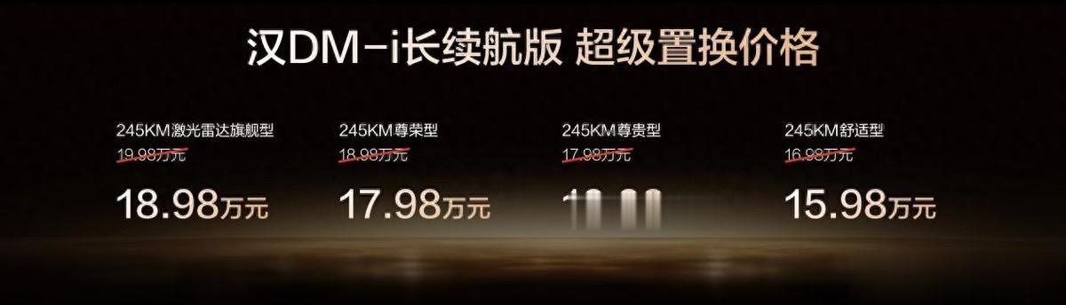 此次,汉DM-i长续航版共推出4款车型,补贴后售价15.98万~18.98万元;汉EV长续航版共推出3款车型,补贴后售价17.38万~20.58万元(10月31日前完成购车可享1万元超级置换补贴)。同时,比亚迪还为用户准备了包含置换补贴在内的至高价值3.8万元七大礼遇。