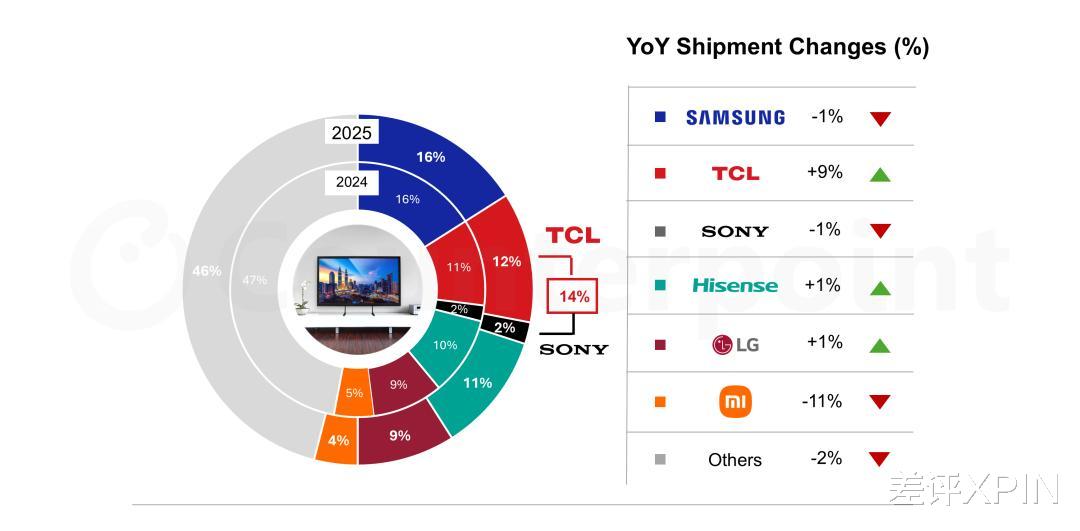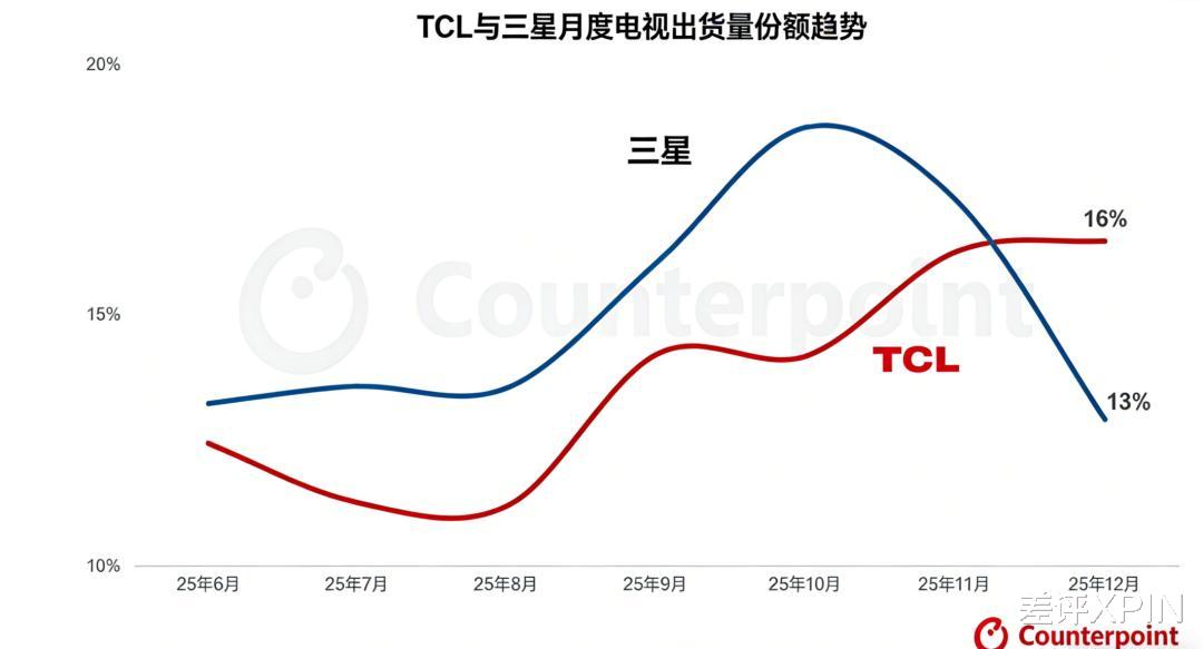 虽然大家开机时间越来越少,但电视圈的斗争一点没消停,Counterpoint 数据显示,TCL 在 2025 年 12 月超越三星,登顶全球电视出货量榜首。