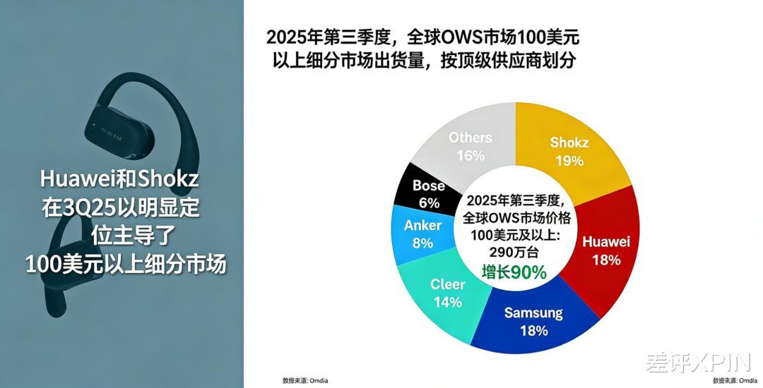Omdia 数据显示,第三季度全球 TWS 耳机出货 9260 万部,同比仅增长 0.33%,但开放式真无线蓝牙耳机的出货量却突破了 1000 万部,同比暴涨 69%,直接抵消了传统 TWS 的下滑。