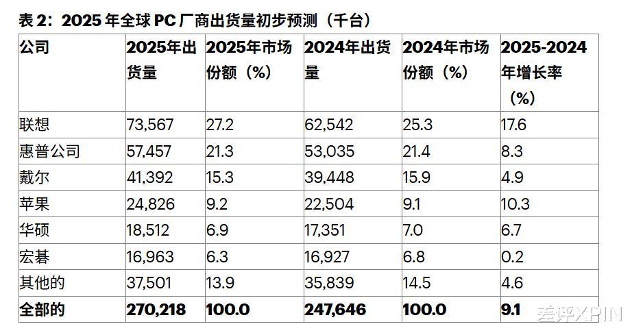 根据 Gartner 的预测数据,2025 年全球 PC 出货量增长了 9.1% ,突破了 2.7 亿台。这增长主要靠两件事:一是 Windows 11 的升级潮,逼着企业换机器;二是大家都怕 2026 年存储涨价,很多企业都在提前囤货。