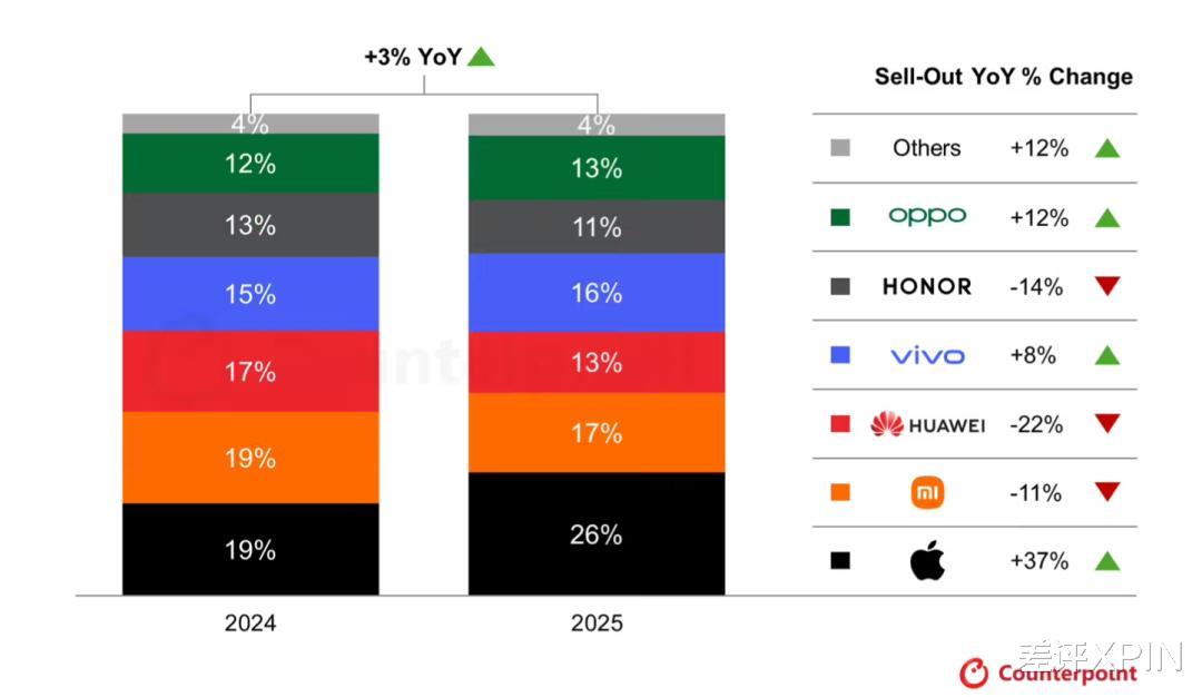 根据 IDC 和 Omdia 的数据,2025 年中国智能手机市场出货量大约在 2.82 亿台左右,相比 2024 年微跌了一些。虽然大盘没涨,但座次全变了。