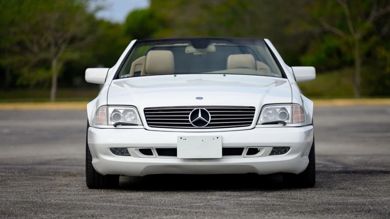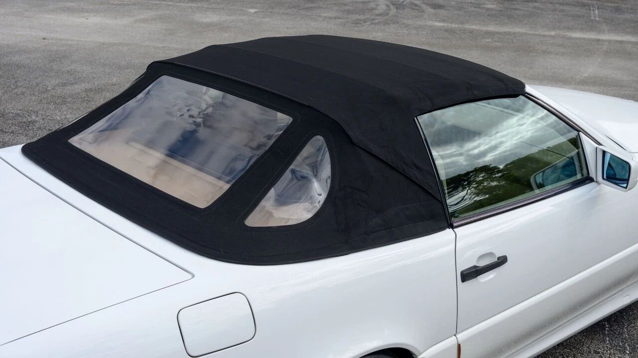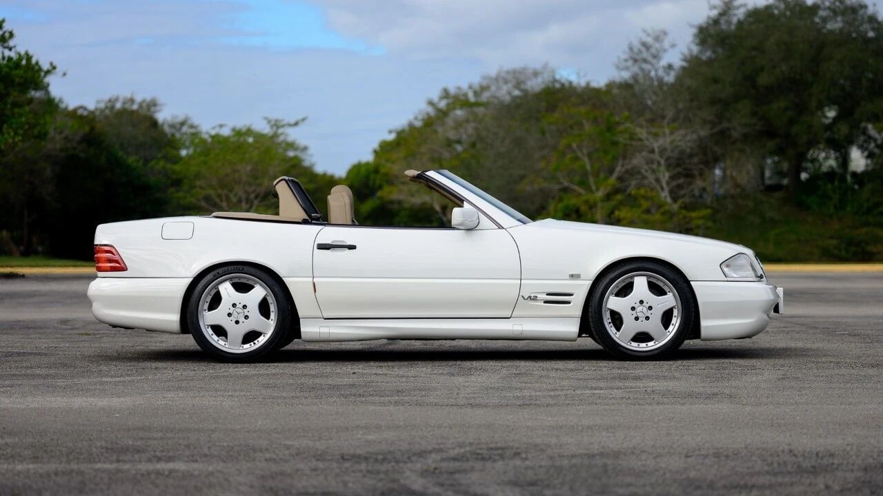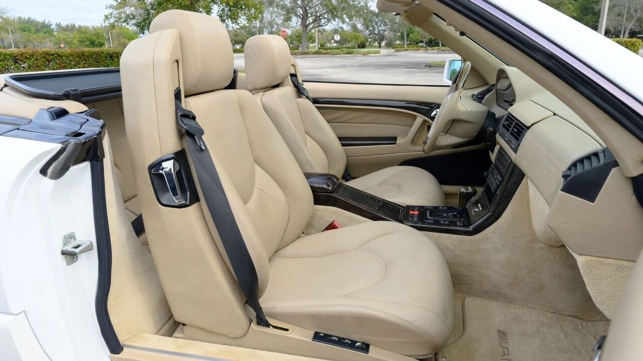 外观上,它依旧保持着当年的优雅与霸气。极地白(149)漆面光亮如新,搭配AMG专属空力套件,线条流畅而不失攻击性。最具价值、也最稀有的配置,是它配备了同色全景天窗硬顶。这项配置在当年选装价极高,产量极少,不仅让车顶线条更流畅、视野更通透,也让这台SL在硬顶模式下拥有媲美双门GT跑车的静谧性与刚性,是R129世代最顶级、最梦幻的配置之一。