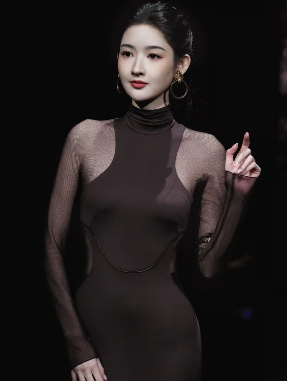 这套造型的核心在于设计与身材的完美契合,将王玉雯175cm的身高优势与曼妙曲线展现得淋漓尽致,半透视哑光透纱材质自带朦胧滤镜,肌肤在纱影下若隐若现,揉出温柔的高级感,既展现了女性的性感魅力,又通过材质的厚重感规避了过度暴露的尴尬。