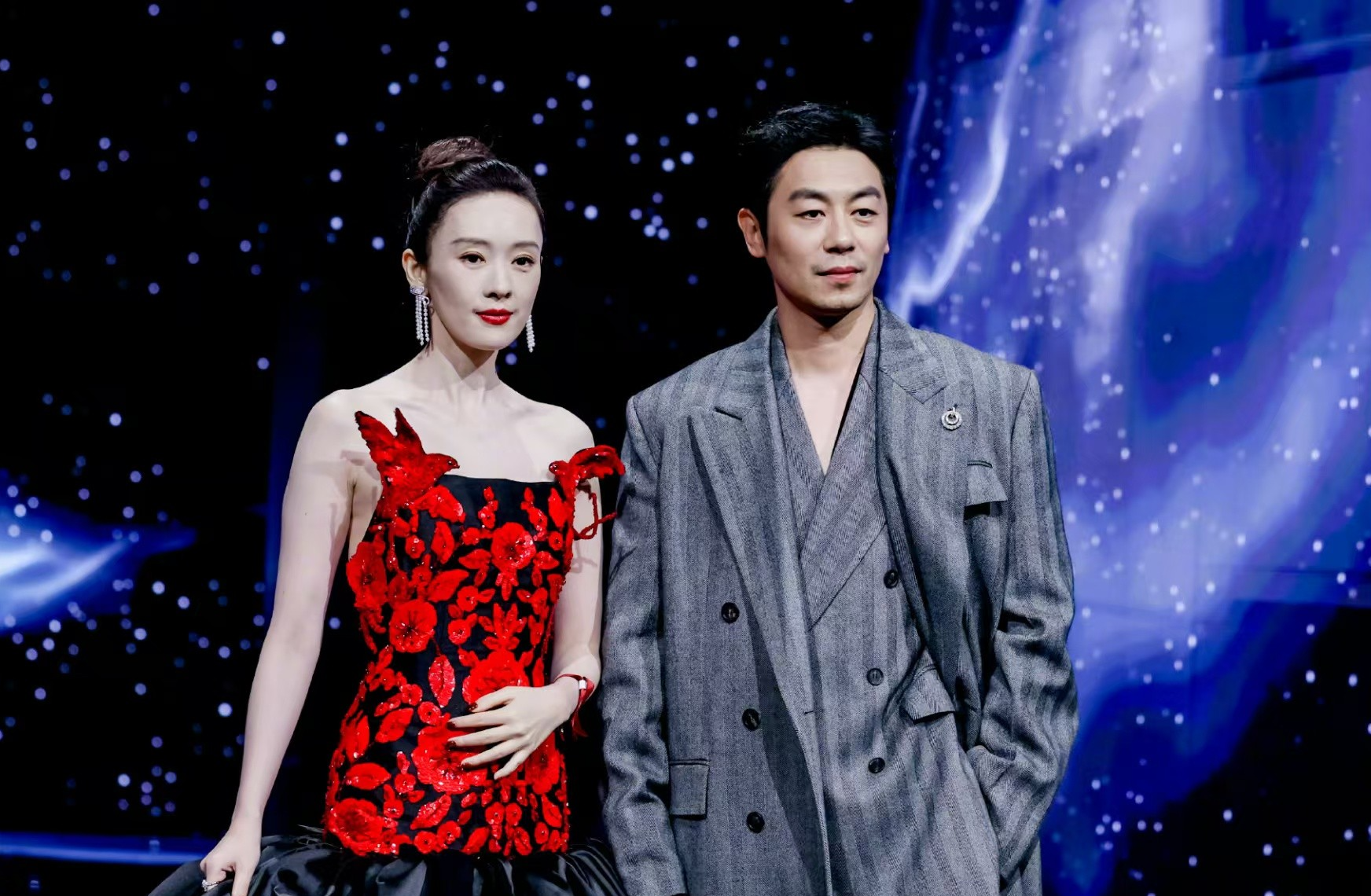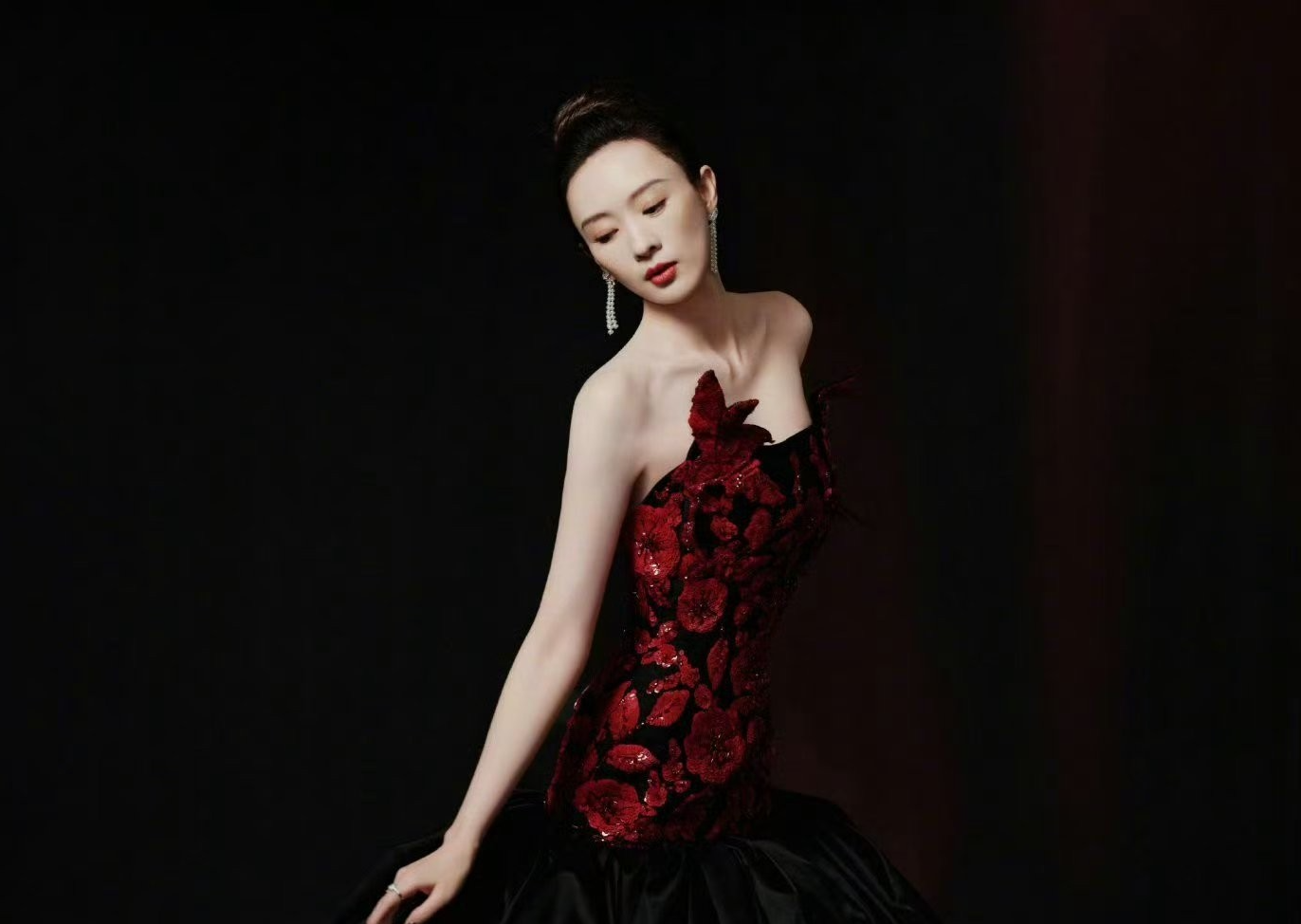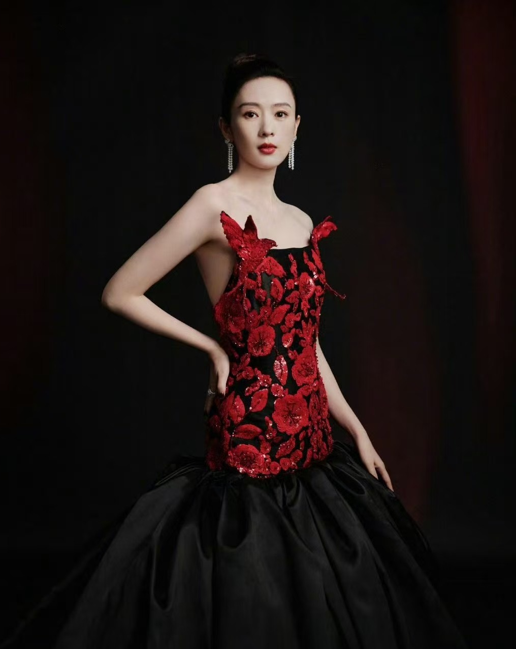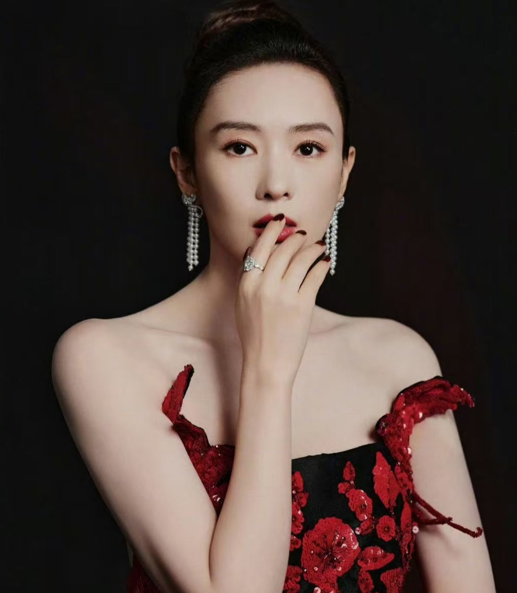 设计上的巧思更让造型兼具美感与高级感,黑红拼色的玫瑰与童瑶的冷白皮形成强烈色彩碰撞,衬得肌肤白皙通透,修身剪裁则精准勾勒出纤细腰肢与流畅的腰臀曲线,将成熟女性的温婉与曼妙展现得淋漓尽致。
