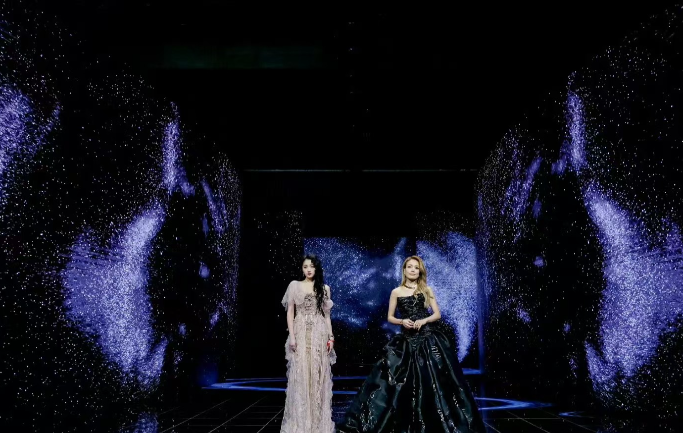 礼裙设计兼具梦幻感与高级感,柔粉底色缀以精致的碎钻刺绣,灯光下流转着细腻的光泽,行走间裙摆摇曳,宛如从童话中走出的公主;高腰剪裁最大化凸显她的长腿优势,垂坠的薄纱裙摆舒展身形,彻底摆脱了过往“显壮”的争议,单侧袖装的设计则让肩颈线条更显流畅。