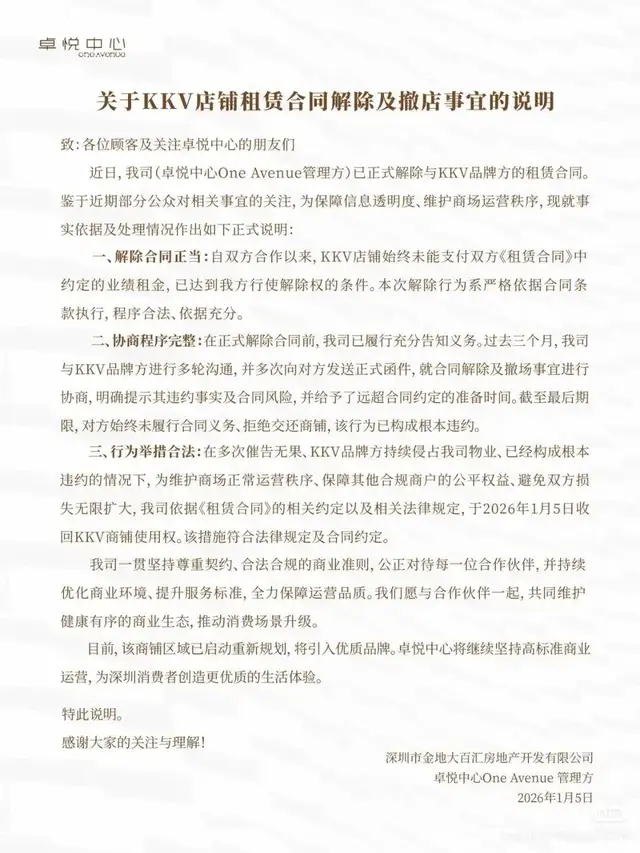 1月5日,卓悦中心官方对外发声,确认已收回KKV品牌入驻的商场铺位,招商端口同步切换至新一轮招租筹备阶段。