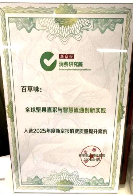 百草味“全球坚果直采与智慧流通创新实践”入选新京报消费研究院评出的“消费质量提升年度案例”。