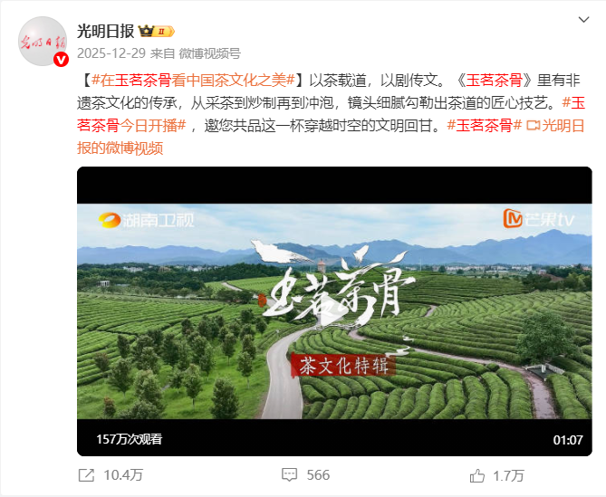 从光明日报的文化背书到各地文旅的争相联动,从非遗技艺的传承创新到年轻圈层的深度共鸣,《玉茗茶骨》用一杯“好茶”,泡出了影视行业的新可能。它让我们看到,优秀的影视作品不仅能带给观众情感共鸣,更能成为文化传播的桥梁、商业创新的载体、生活美学的延伸。