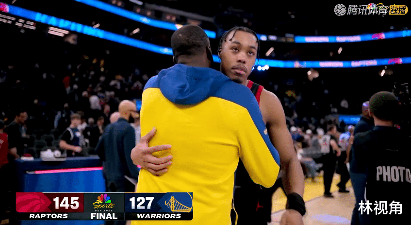比赛结束,格林从替补席起身,和下场的队友击掌,看起来心情还不错,之后走入场内,一把抱住走过了的巴恩斯,与其拥抱致意。