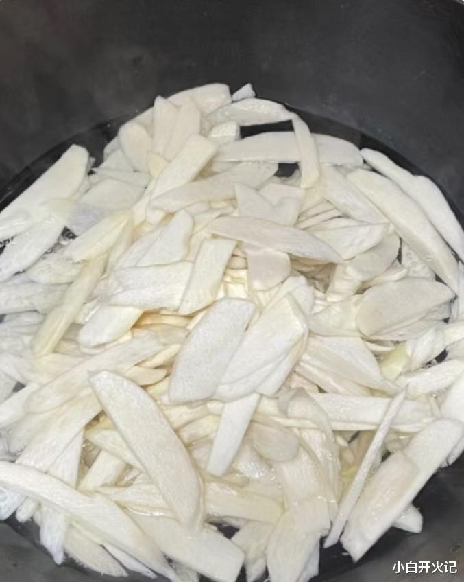 切茭白是快乐源泉。剥开外衣,“咔嚓”一声脆响,像给冬天拆快递。先切段再切片,厚度约两枚硬币,太薄没存在感,太厚又欺负肉片。切完别直接下锅,水开焯30秒,滴两滴白醋锁色,茭白瞬间从“乳白”升级成“冷白皮”,口感也更清甜,这一步等于给它做了个“紧致面膜”,待会儿炒起来才不会“软塌塌”。