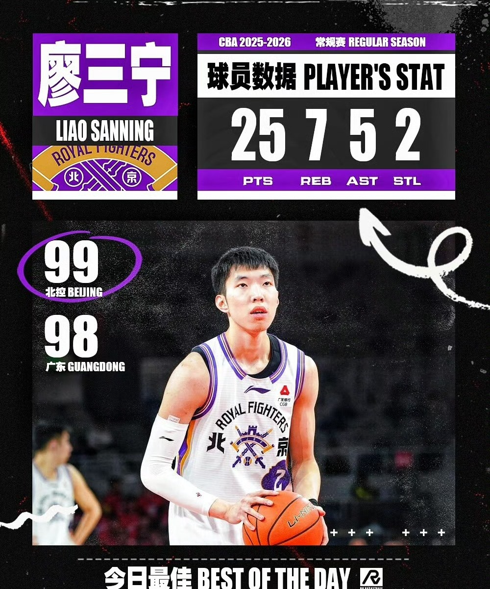 1月17日CBA常规赛,广东男篮98:99不敌北控男篮,廖三宁全场17投8中,罚球10中9,拿下25分7篮板5助攻2抢断。最后时刻抛投绝杀一剑封喉,值得一提的是,同样的位置在最后两分钟,廖三宁连续打进三次。