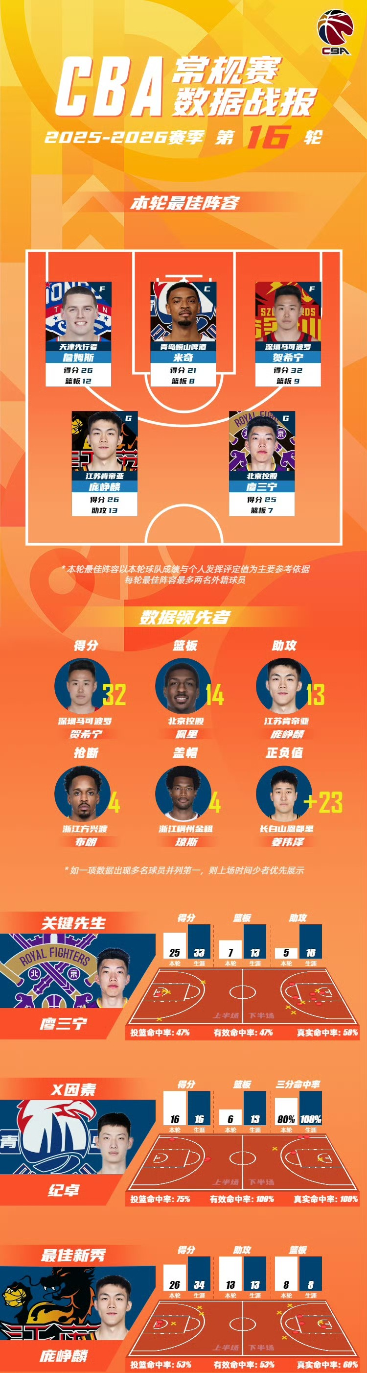第16轮最佳阵容:天津男篮外援大卫·詹姆斯,青岛男篮外援乔丹·米奇,深圳男篮贺希宁,北控男篮廖三宁,江苏肯帝亚男篮庞峥麟。